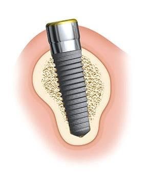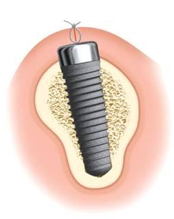 La gencive est remise en place et suturée dans sa position initiale. Les implants sont alors entièrement enfouis sous la gencive, et donc très bien protégés. Si cette option est choisie, il faudra rouvrir légèrement la gencive deux à six mois plus tard pour dégager la tête des implants afin de réaliser la prothèse.